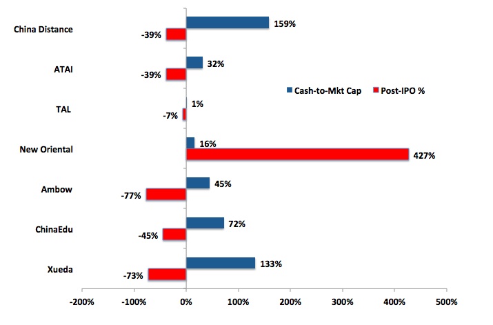Leading Chinese Ed Companies: Post-IPO Performance v Cash-to-Market Cap