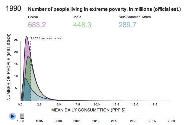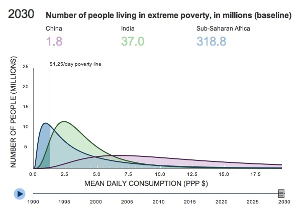 Brookings Institution provides some interesting (and interactive) perspective on extreme poverty over the 1990 to 2030 estimated period, which it calls the Final Countdown. As extreme poverty (less than $1.25 per day) approaches zero, the remainder of afflicted peoples are in the weakest and most fragile states.