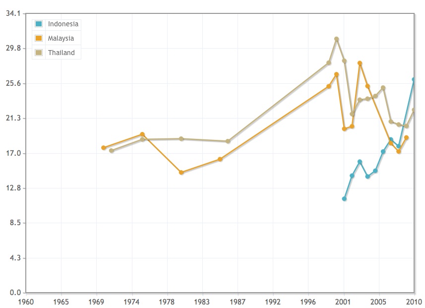 However on the homefront there are questions. As the chart below illustrates, Malaysia’s total public spending on education has fallen dramatically, from 28 per cent of total government expenditure in 2003 to 17 per cent in 2008. This fall is an even stepper than the post-1997 Asia financial crisis, at a time when Malaysia was one of Asia’s economic darlings. Since 2001 Thailand’s levels also fell but have started to retrace earlier levels. Meanwhile Indonesia’s have increased most dramatically, far exceeding both of its neighbors.