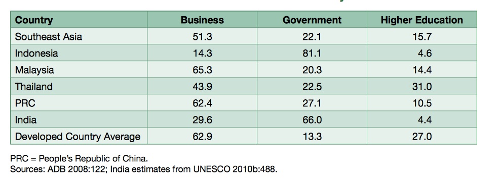 - Indian higher education contributes one-sixth the level of the developed world to R&D, with government the main lever. Indonesia is also highly reliant on government R&D.