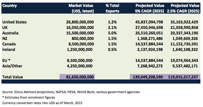 Second, with historical growth rates over the past decade of between 2 and 3 per cent annually, the projected value in 2025 can be illustrated in two scenarios: moderate growth of 2.5% p.a. and high growth of 5% p.a. Note that I have assumed no tuition inflation or changes in relative currency rates over the period, which may render these results conservative from a dollar standpoint. Using these assumed growth rates, the projected market value in 2025 is between $119 billion and $139 billion, with a range of $35 billion and $46 billion in revenue generated annually in the United States alone. Splitting the difference brings an annual market value of $130 billion.