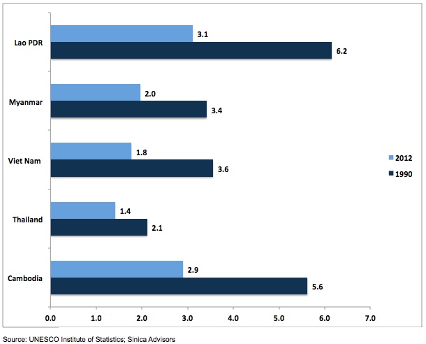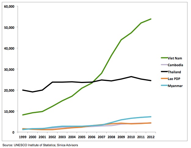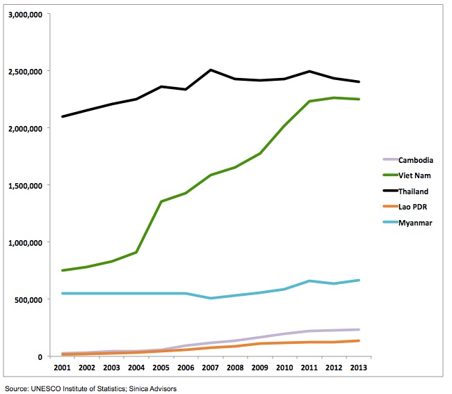 Enrollments in Myanmar and particularly Laos and Cambodia have grown incrementally from a small base but remain a fraction of Vietnam’s participation at the college level. To cite one example, for all the noise around the opening of Myanmar, the country’s students numbered approximately 666,000 in 2013 and any future “take off” phase is difficult to predict and probably many years away.