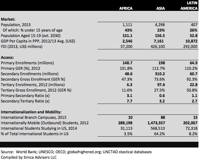 Figure A provides some basic comparative data aggregated across Africa, Asia and Latin America–three of the world’s largest development markets (statistically we are referring here to sub-Saharan Africa). What is most striking is Africa’s severe gap in higher education in the face of a youth bulge, and the increasing number of students that are looking elsewhere in the world to fulfill their higher learning needs.