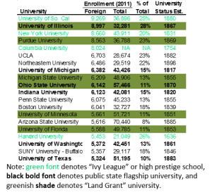 Fifth, there are signs of international student capacity constraints at many US universities, driving Chinese students to enter state, private and community colleges. International students already account for over 20% of total enrollments at such prominent US universities as USC, University of Illinois, New York University, Purdue University, UCLA, Northeastern University, and Harvard. We believe that the Top 100 schools on which the Chinese have historically focused are saturated. This can be seen anecdotally in headline news such as this Chicago Tribune article on Chinese students at the University of Illinois as well as in our conversations with new international recruitment models like Wellspring International Education, which is doing much work with regional universities in the US. Wellspring believes those schools with strong rankings on the US News regional lists with the STEM programs sought by Chinese students do still have an opportunity to grow. Indeed, just a few miles from our LA offices, Santa Monica College enrolls 3,320 international students representing 10.3% of total school enrollments, with over half to three-quarters coming from Asia.