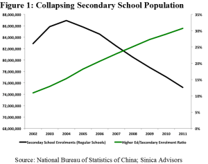 First, China’s available pool of high school graduates—as measured by future enrollments in the system—is rapidly declining. According to Ministry of Education figures, regular (non-vocational) secondary school enrollments reached a high of 86.9 million students in 2005 and declined by almost 20% to less than 73 million by 2013 (see Figure 1). As a consequence China’s gaokao, or higher education exam, peaked in 2008 at 10.5 million and is estimated to register 9.4 million students this June. For the past decade, increasing graduation rates and college enrolment rates in China have acted as a counterbalance to a quickly dwindling student pool. But these rates are reaching relatively mature levels while China’s age 15 population, according to World Bank estimates, continues to decline further from 10.3 million in 2010 to 8.6 million by 2020.