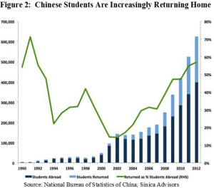 Third, the scarcity value of having a US degree in China based on a past notion that only China’s “best and brightest” can study abroad, is long gone and further diminishing as foreign enrollments surge. There are a number of consequences to this: not only is a US degree no longer a golden ticket to success in China; employers can have a hard time distinguishing between good and average students, not to mention recognizing the thousands of lesser known US colleges from which Chinese students matriculate. There is also the question of Chinese students returning to a labor market after four years abroad (and most do, see Figure 2), with fewer local guanxi (connections), access to job recruitment activities, and local market knowledge that is applicable to China’s rapidly changing economy. In this sense, studying abroad can also be a disadvantage in China’s labor market. In my own discussions with Chinese counterparts over the past decade, US study has increasingly been perceived as a way for rich kids who are not shudaizi (bookworms) with middling gaokao scores (if they take the gaokao at all, and not just opt for the “luxury” of taking the SAT earlier on) to buy a fall-back option should they not secure entrance to a Tier 1 or 2 Chinese university. Of course, there are exceptions: elite US schools or programs in the Health Sciences, Engineering and selective MBAs, still carry cache back home. And multinational companies heavily recruit English-friendly employees that have graduated from well-known US schools. But the overwhelming majority of Chinese students are not enrolled in these prestigious programs and the future of employment in China resides not within multinationals but non-state, small and medium size enterprises. (And don’t even start on the future of over-priced executive MBAs amidst China’s continued austerity campaign.) Over time, we expect these factors to weigh more heavily on Chinese student decision-making when it comes to spending extended periods of time overseas.