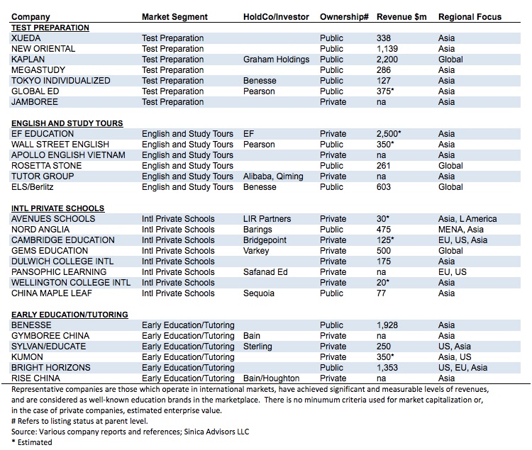 Tables 1 and 2 list some of the more well-recognized and financially impactful education companies in the world across respective segments mentioned previously: Test Preparation, English and Study Tours, International Private Schools, Early Education, Higher Education, International Study and Supplementary Skills. The majority of these companies serve the haves rather than have-nots.