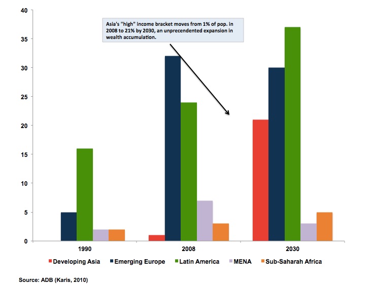 Figure 1: Higher Income Bracket (>$20/day) as % Total Population by Development Region: Asia Moves from 1% to 21% Between 2008 and 2030F