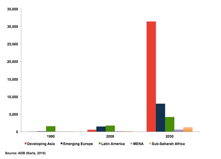 The full impact of Asia’s relative position in terms of emerging wealth at the individual level is even more profound when considering the percentage changes in Figure 1 against overall population size, as measured in Figure 2. On this calculation Asia’s middle class incomes rise from less than USD 1 trillion in 2008 to a mind-bending USD 31 trillion by 2030. Let’s repeat that: a $30 trillion bracket expansion for populations over $20/day in 15 years.