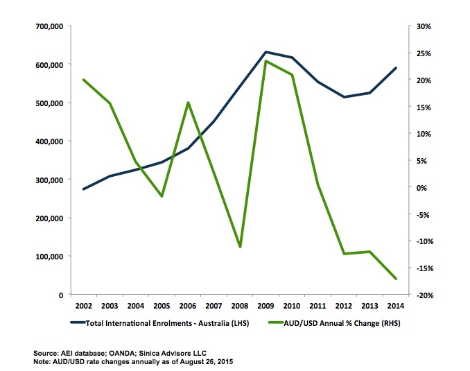 Figure 4: Australian International Enrollments and the Aussie Dollar (Annual % Change)