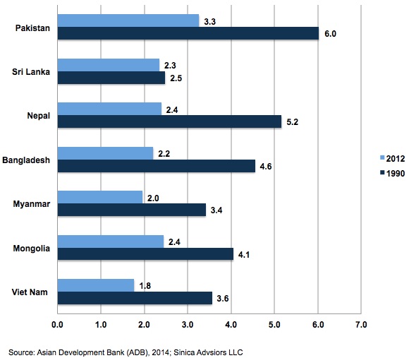 Consider that Pakistan’s birth rate per household has dropped from 6 in 1990 to 3.3 in 2012; Nepal from 5.2 to 2.4; and Bangladesh from 4.6 to 2.2 over the same period (see Figure 3). Vietnamese birth rates have dropped from 3.6 per household in 1990 to 1.8 per household by 2012. As a result, the majority of birth rates in Asian frontier markets have declined by over 50 per cent level in a single generation.