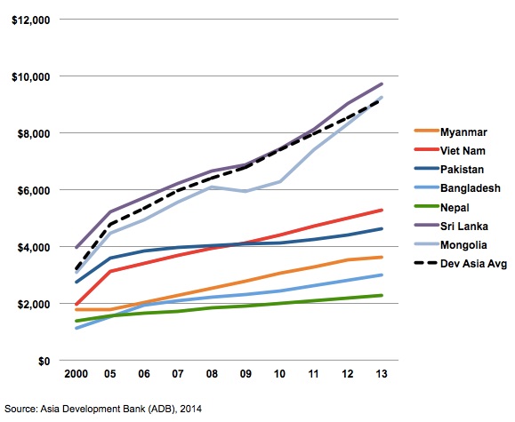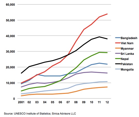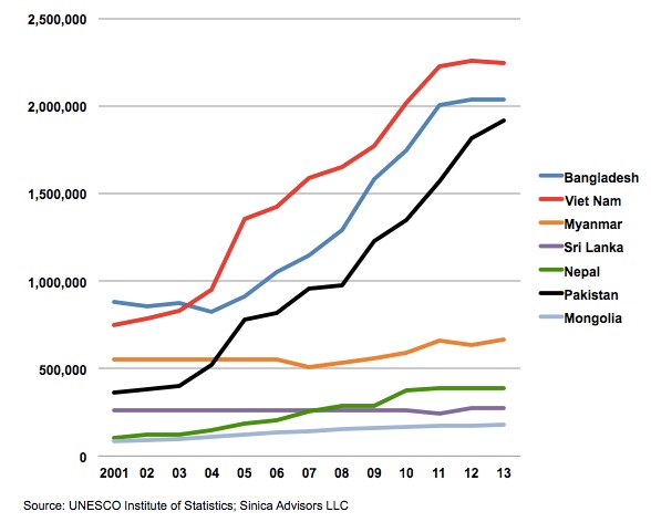 Elsewhere, enrollments in Myanmar and Nepal have grown incrementally from a small base but remain a fraction of Vietnam’s participation at the college level. To cite one example, for all the noise around the opening of Myanmar, the country’s tertiary students numbered approximately 666,000 in 2013 and any future “take off” timing is difficult to predict, although certainly not in doubt as the country begins to open to the outside world.