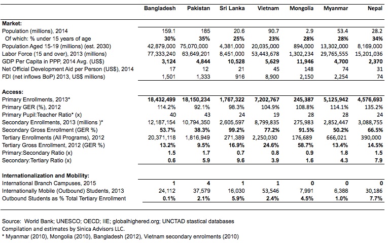 In defining the frontier within Asia, we have selected nine countries for comparative analysis, four of which are included in one or both of the FTSE and MSCI indices—Bangladesh, Pakistan, Sri Lanka and Vietnam—and an additional three—Mongolia, Myanmar, and Nepal–which we think merit inclusion as potentially attractive education markets for interested investors, education providers and stakeholders.