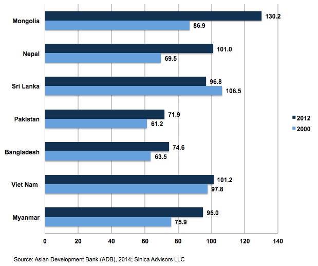 Following behind Vietnam are Myanmar and Nepal, both of which rose dramatically to primary completion levels of 95 and 101 per cent, respectively, in 2012. Sri Lanka has maintained near universal primary completion since 2000 as has Mongolia, the latter benefiting from relatively low population demographics. These developments have pushed education pipelines toward higher education demand and beyond the most basic needs.