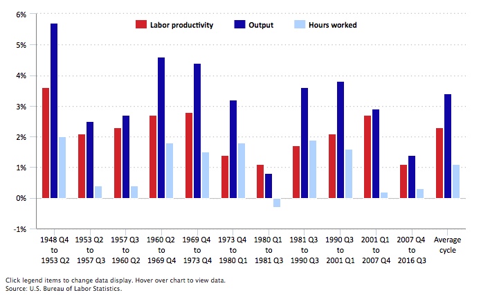 Figure 1: Annual Growth Rates – Productivity, Output and Hours, 1948 to 2016