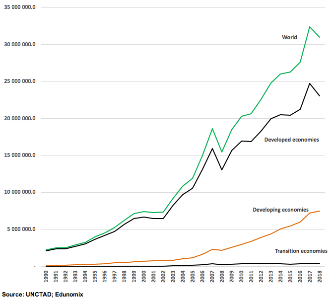 First, the overall trend in outbound foreign direct investment (FDI) shows a steady climb despite a few blips in the Great Recession in 2007 and 2018. Total cumulative FDI exceeded $35 trillion by 2019 (see Figure 1) and the long-term trend is undoubtedly robust. Most importantly, outbound investment from developing countries is in an early acceleration trend and already comprises approximately $7 trillion by 2018, or 20% of global total. Expect this to continue.