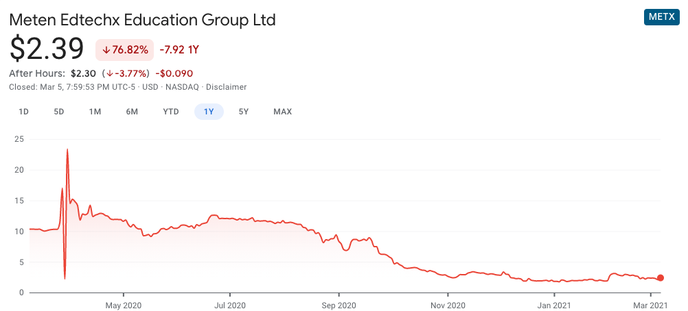 To date, we only have one example of an education SPAC that has actually completed an acquisition: Meten EdtechX.
