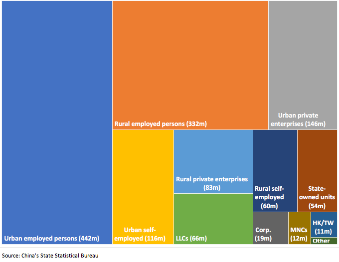 Third, China’s most dynamic employment sectors—urban, private, incorporated—account for 177 million people as of 2020 (Figure 5). These segments are what many people may think about when they contemplate China’s miraculous leap in wealth, innovation and productivity while looking out of a luxury hotel window in Shanghai. Yet they represent a minority segment of the labor market. What about the undefined 442 million “urban employed persons” which range from state sector to government and unskilled employment, or, even less visible, China’s rural sector employment which exceeds 400 million people?