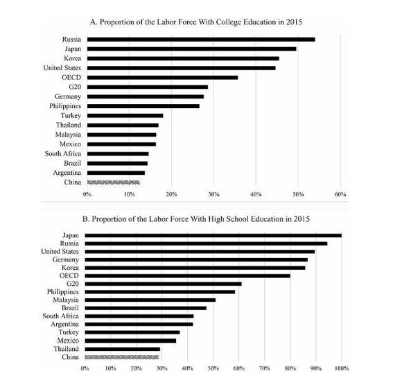 China may have created the most impressive advance of educational attainment in history but it also suffers from a growing skills gap. In fact, China has one of the least educated workforces in the world as measured by the proportion of its labor force with a high school and college degree.