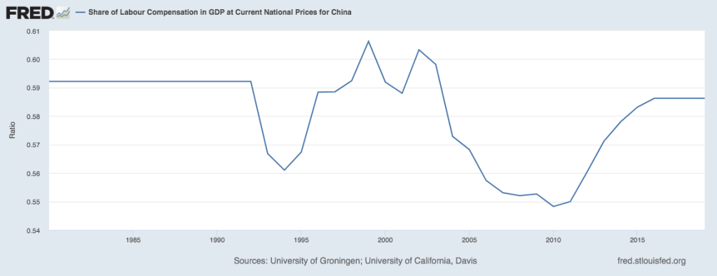 A second area is worker compensation and spending power. Labor’s percentage of GDP peaked in the 2000s before dropping to a historic low of 55% in 2010. It currently sits below long-term trends at 58% (Figure 3). Should we care? After all, labor’s share of GDP has fallen to less than 60% of GDP. Yet this comparison is flawed. Unlike the US, China must have a substantially higher per capita income (currently ranked $11,652 in nominal terms, ranked #73 in the world) to fuel its next phase of economic growth which is contingent on higher value goods and services.