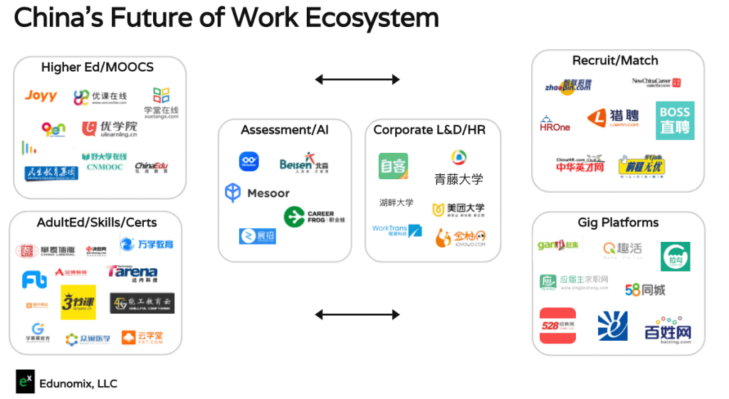 Based on my own observation, and ongoing client work in the sector, China’s investable universe for the education-to-labor market is already taking shape and being led by a collection of enterprises that comprise a skills-based ecosystem, from MOOCs (which drive a large proportion of learning and development inside and outside the corporate sector) to specialized skills platforms along industry verticals, to various types of HR, gig and employment platforms that optimize the search, assessment and job matching process using algorithms and assessment tools.