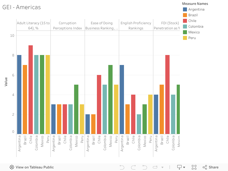 The Americas were led by Mexico (18) and Chile (20), and further down the list, Brazil (29) and Argentina(25). The contrast between Mexico and Brazil is instructive: each with large populations but a different set of education profiles and increasingly divergent economic paths in light of Brazil’s deepening recession. Separately, Chile has emerged as a relatively strong investment case within the Americas, surpassing Argentina and gaining ground this year.Peru (35) and Colombia (44) rank in the middle of the GER. On a global basis, nearly all countries from the Americas fell in relative ranking from 2016 levels, the most dramatic of which being Colombia.